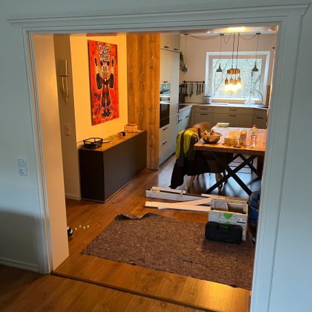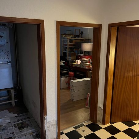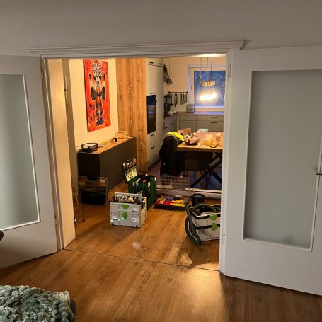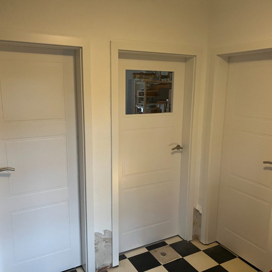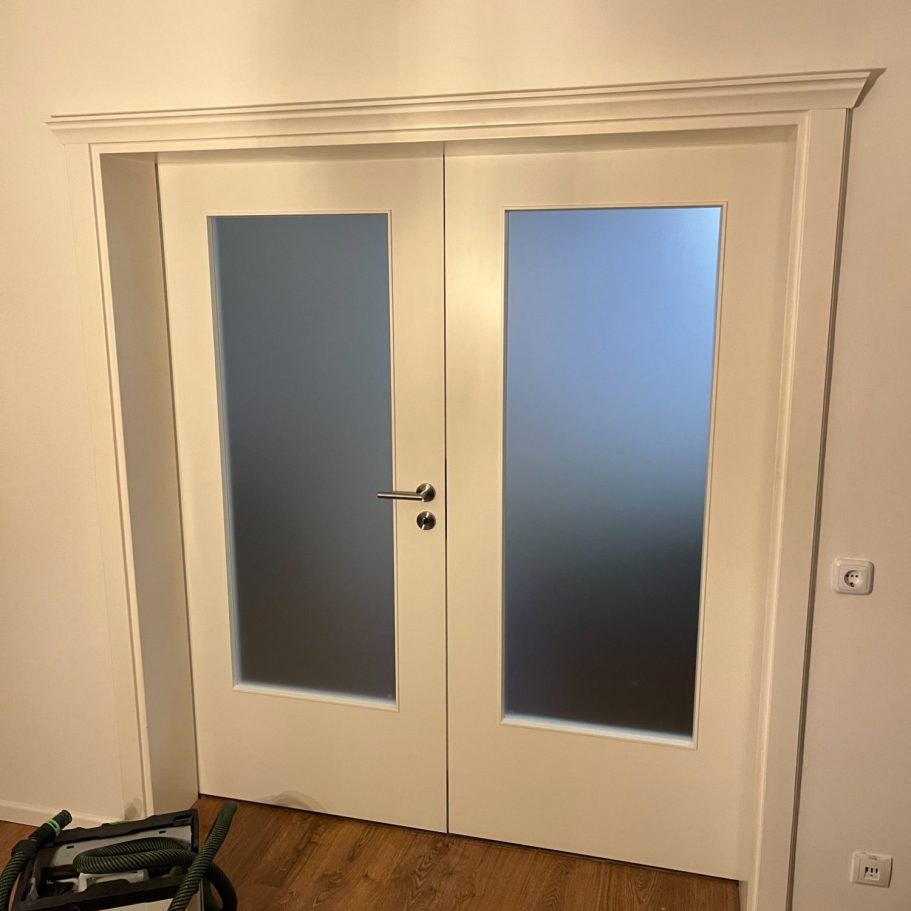 Update für den Wohnbereich: Einbau von zwei neuen Türblättern in eine bestehende Stahlzarge. Hier war Präzision gefragt: Damit die neuen Türen perfekt schließen, wurde im Vorfeld exakt Aufmaß genommen. Die Montage der modernen Weißlack-Türen mit Glasausschnitt erfolgte sauber und passgenau vor Ort. Ein riesiger Unterschied in der Raumwirkung!